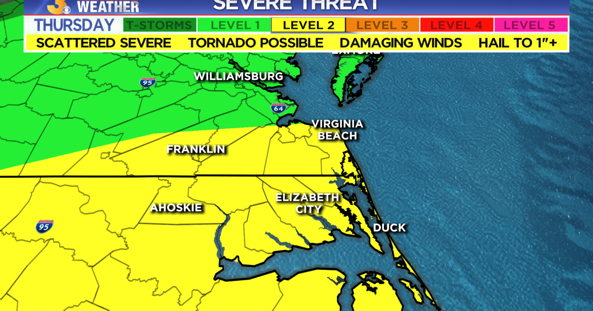 The cold front that will bring the rain on Wednesday, will actually lift over the area on Thursday as a warm front. That means another temperatures boost. Temperatures will soar to near 70. Heavy rain will be possible at times especially during the afternoon and evening. We even have the threat of severe weather. Yes, we are actually tracking the threat of severe weather in February. The Storm Prediction Center has all of the Albemarle, OBX, Southside and portions of inland Virginia at a Level 2 for severe weather. That means scattered severe storms are not out of the question. The biggest threat will be damaging wind gusts and flooding. A little lower on the threat scale, but still a threat are tornadoes. The rest of the area including the Peninsulas and Eastern Shore are at a Level 1, which means an isolated severe storm is possible. Many of us could see 1.5-2+ inches of rain. Temperatures will fall into the low and mid 50s overnight.