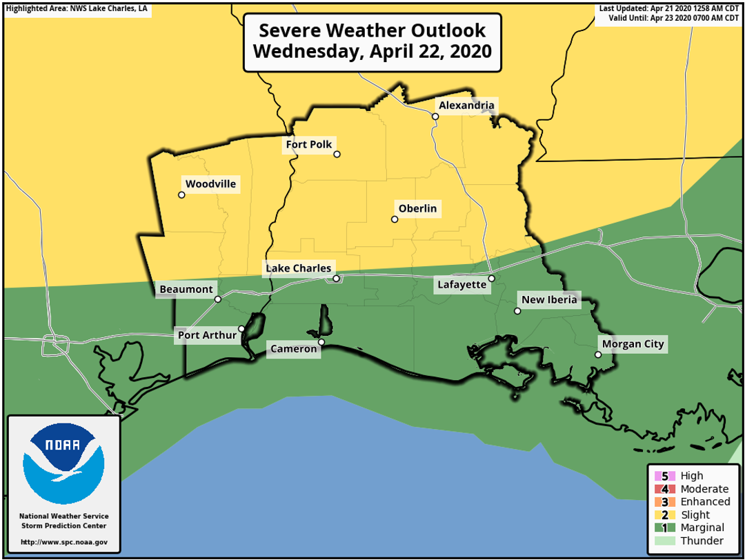 The threat will likely begin at about 1 p.m. Wednesday in southwest Louisiana and last through 9 a.m. Thursday; begin at about 3 p.m. Wednesday in Central Louisiana and last through 9 a.m. Thursday; and begin at about 3 p.m. Wednesday in south-central Louisiana and last through noon on Thursday.