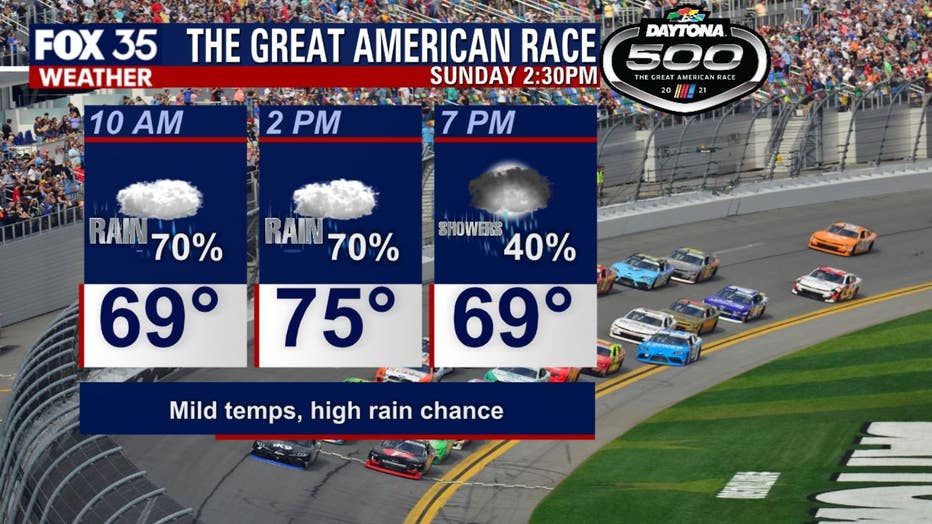 On Sunday, expect mostly cloudy skies, with a high near 76 degrees at the Daytona International Speedway.
