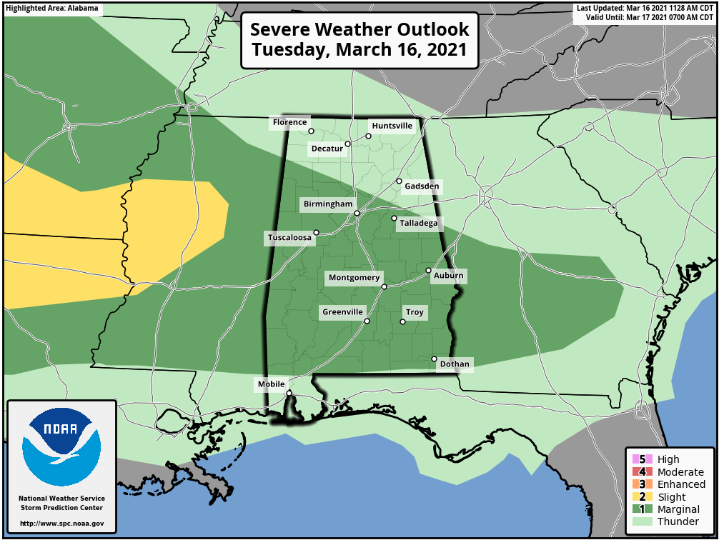 DANGEROUS SEVERE WEATHER THREAT TOMORROW/TOMORROW NIGHT: SPC maintains a “moderate risk” (level 4/5) for a good part of Alabama, including places like Birmingham, Montgomery, Tuscaloosa, Anniston, Gadsden, and Florence. An “enhanced risk” (level 3/5) covers most of the rest of the state.