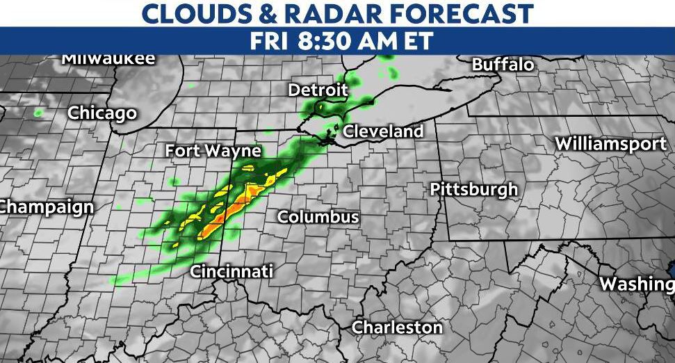 Starting overnight Thursday, a cluster for storms develops in the upper Midwest, northwest of Ohio. This storm system quickly dives through Michigan and northern Indiana into early Friday around 2 a.m.-7 a.m., sinking into parts of western Ohio by sunrise.