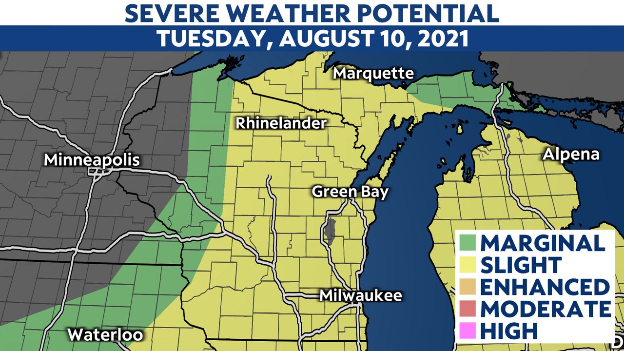 The severe risk increases Tuesday afternoon. The Storm Prediction Center has placed much of Wisconsin in a slight risk (severe level 2 out of 5 or "possible") for severe storms.