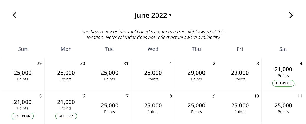 - Off-peak: Fewer points are required during off-peak times, starting at 3,500 points per night