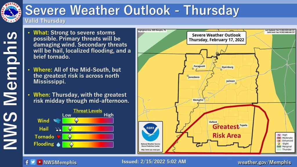 The Mid-South region is under a slight risk for severe weather for Thursday with the greatest risk area in North Mississippi.