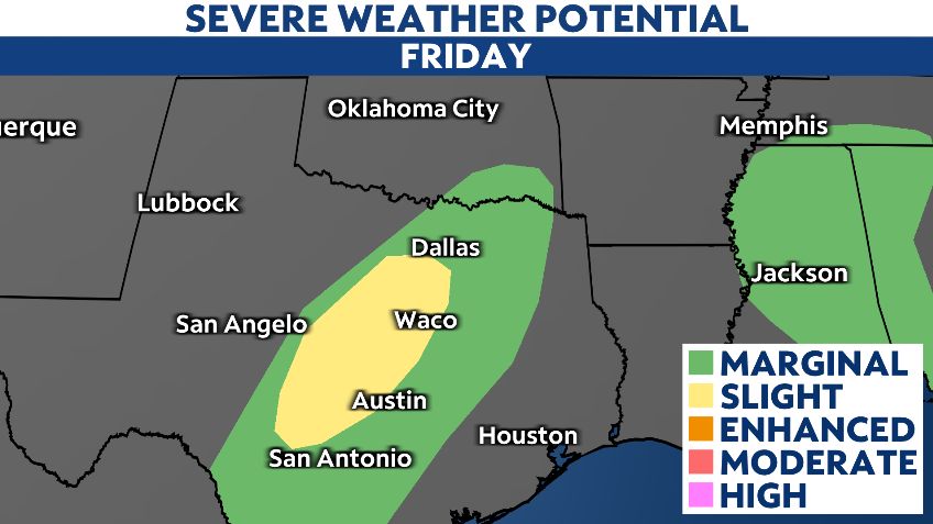 Into the first part of the weekend, the threat for severe storms lingers but will be slightly lower. A large area across Texas, including DFW, Austin and San Antonio, will be at a marginal risk (level 1 out of 5) of seeing severe storms.