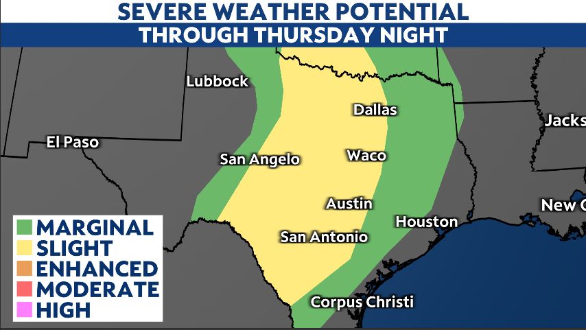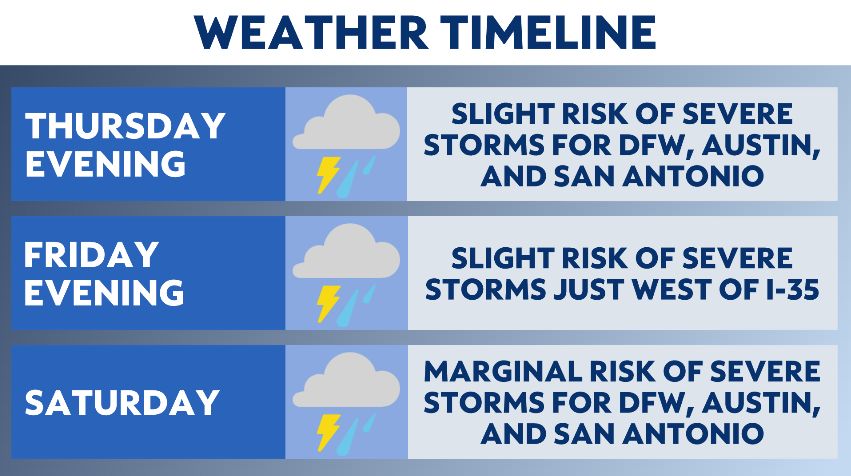 There is a slight risk of severe storms for a large area across Texas both Thursday and Friday. A marginal risk has already been issued for Saturday across much of the state.