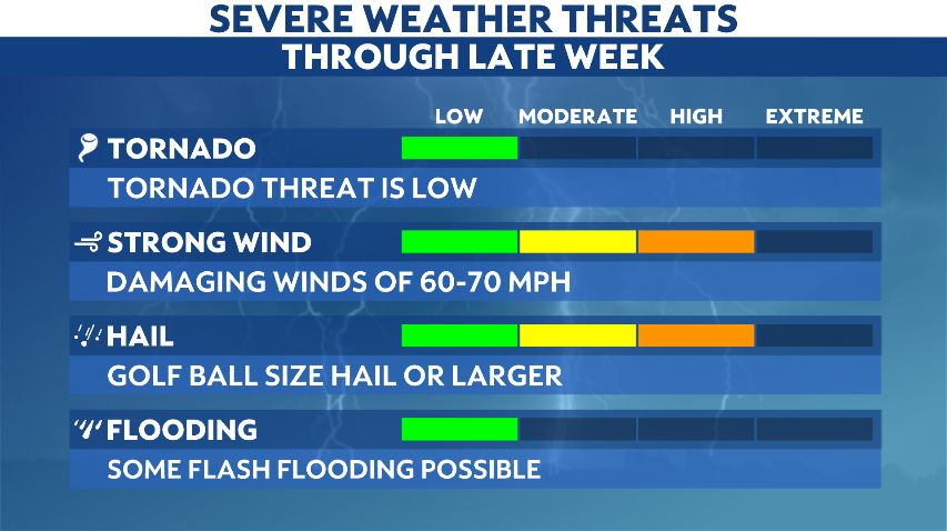Major metro areas including DFW, Austin and San Antonio may see strong to severe storms in the coming days. The primary threats will be very large hail and damaging wind gusts.